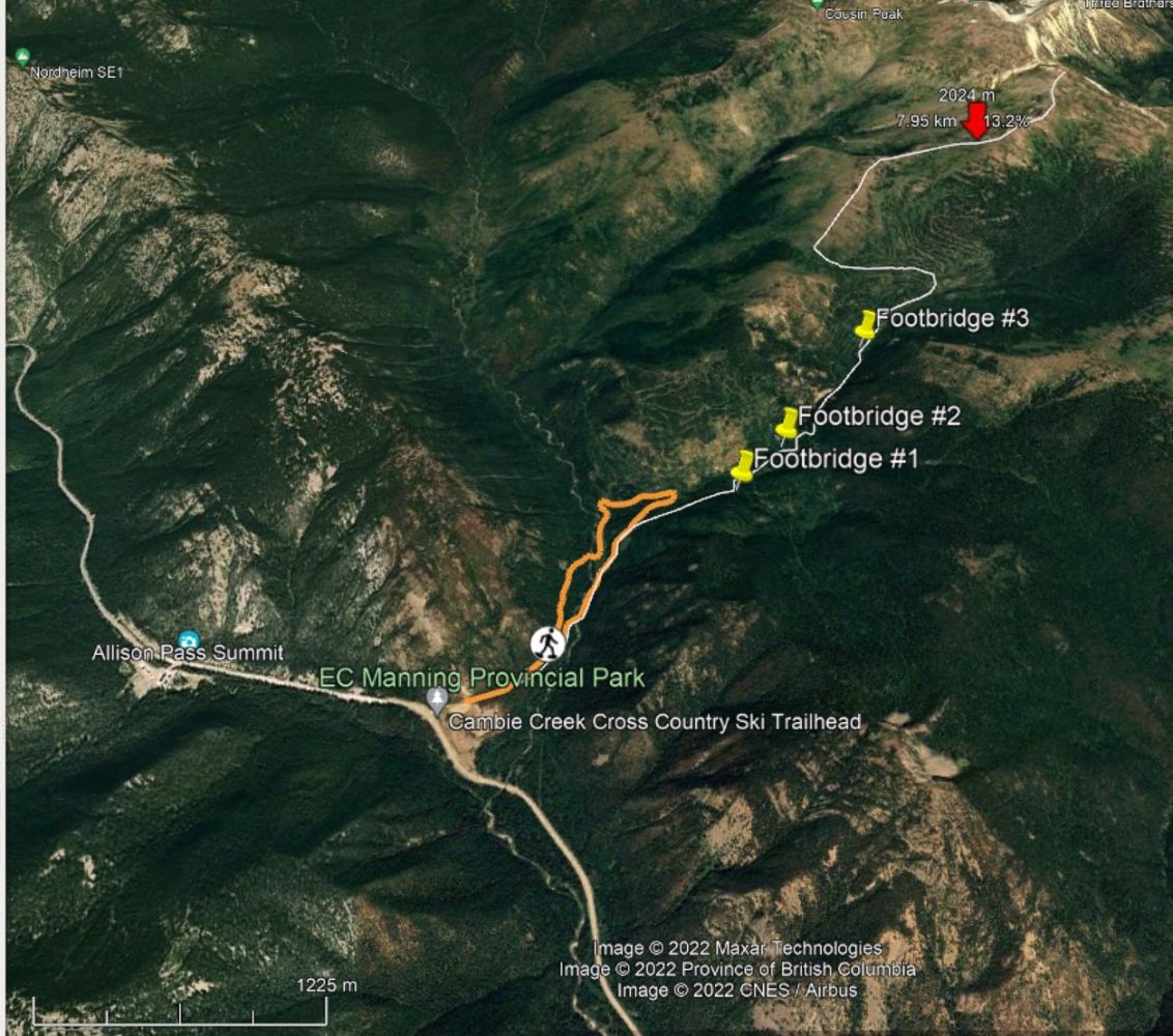 This project was initiated by the B.C. Mountaineering Club in 2023 to replace three washed out footbridges on the Fat Dog Creek trail in Manning Park. The first bridge was replaced in 2023. A further two footbridges are in need of replacement. The work in 2025 will replace one footbridge.